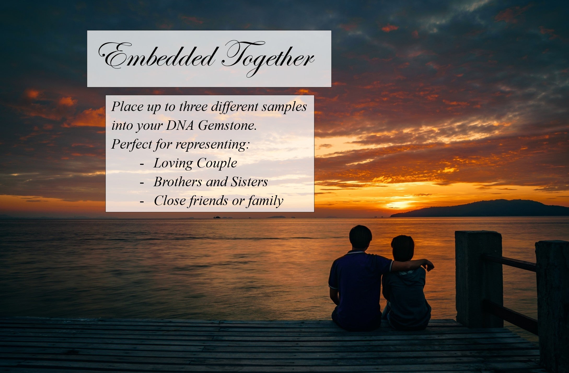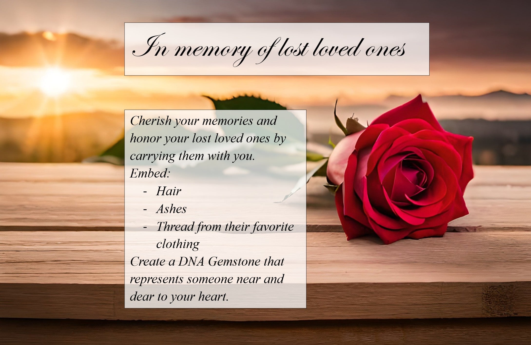 A DNA Gemstone holds the essence of your most cherished memories. By embedding a keepsake or DNA into a gemstone, you create a unique piece of art that carries personal significance, transforming an ordinary gem into a profound connection to loved ones or meaningful experiences. The optional Color Dot placed at the center of the gemstone is a subtle representation of its contents. Whether it’s hair, ashes, thread, or a tiny memento, this innovative concept offers a timeless way to preserve what matters most, creating an heirloom that can be passed down through generations.